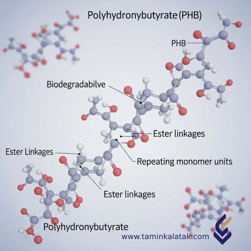 PHB представляет собой биоразлагаемый полиэфир с химической формулой (C₄H₆O₂)ₙ. Он синтезируется определёнными микроорганизмами в условиях дефицита питательных веществ (например, азота). PHB характеризуется высокой степенью кристалличности (60–70%), что придаёт ему жёсткость и прочность, сравнимые с полипропиленом (PP). Однако, в отличие от PP, PHB полностью биоразлагаем. Полимерные цепи, как правило, линейные, а его механические свойства зависят от молекулярной массы и условий синтеза.
